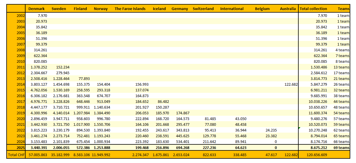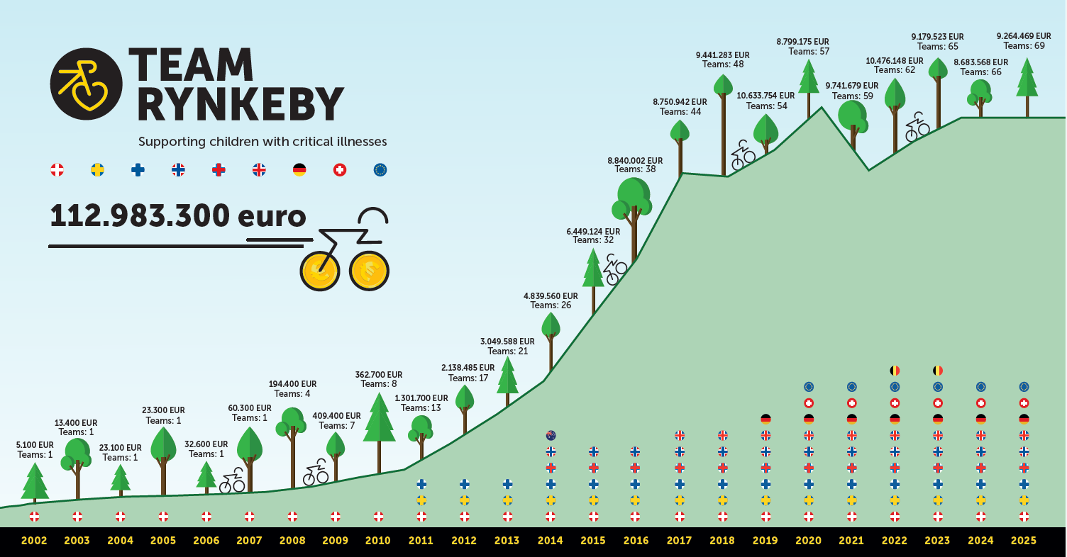 Rynkeby Foods war der Hauptsponsor dieser Fahrt, welche auch durch andere Unternehmen unterstützt wurde. Die Radfahrer*innen, die diesem ersten Team Rynkeby Team angehörten, fanden so viele Sponsoren, dass nach einer Woche 5.100 € Profit erzielt worden waren.