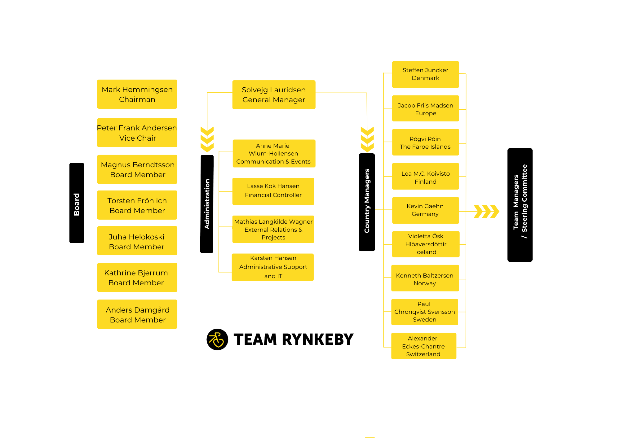 Team Rynkeby wird von der Team Rynkeby Foundation geleitet. Es besteht aus dem Vorstand und der Direktorin, die sich zusammen mit dem Country Manager für jedes der Länder, in denen Team Rynkeby vertreten ist, um die tägliche Geschäftsführung kümmert. Es ist üblicherweise der Country Manager, der den Kontakt zu den Teilnehmenden der Teams in den einzelnen Ländern hat. Jedes Team wird vom Team Manager zusammen mit einem Lenkungsausschuss geleitet, der aus einer Reihe von Teilnehmenden mit unterschiedlichen Rollen besteht. Jedes Team verfügt über eine Reihe von Schlüsselpersonen, die unter anderem für Finanzen, Sponsoren, PR und Service verantwortlich sind.